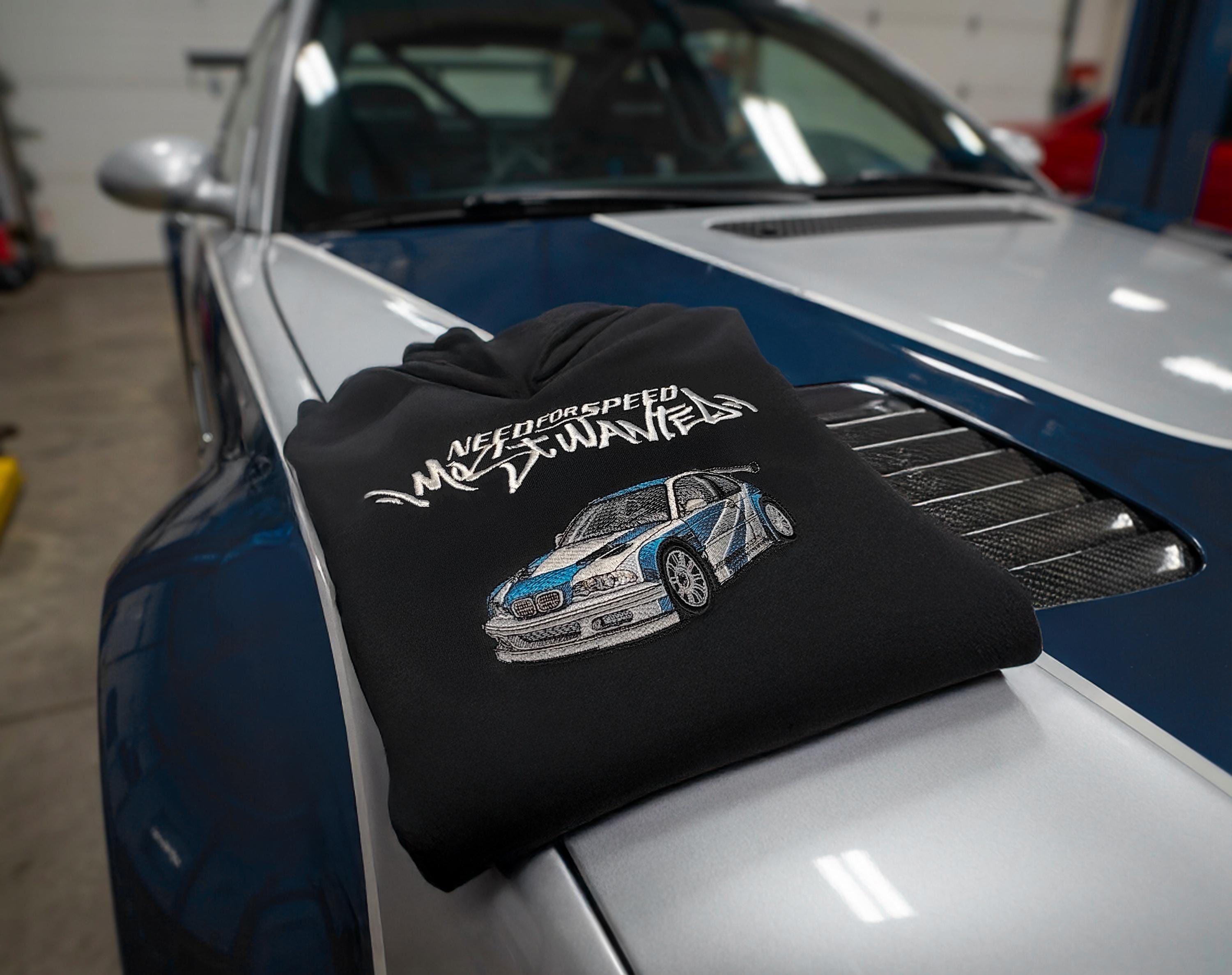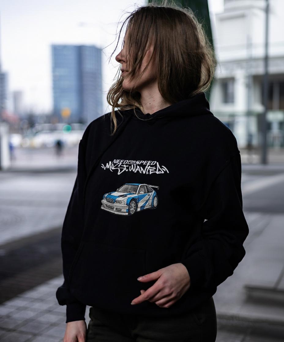 Need For Speed Most Wanted BMW E46 M3 GTR Embroidery Hoodie. The “Blacklist” design is also embroidered on the back of the hoodie.